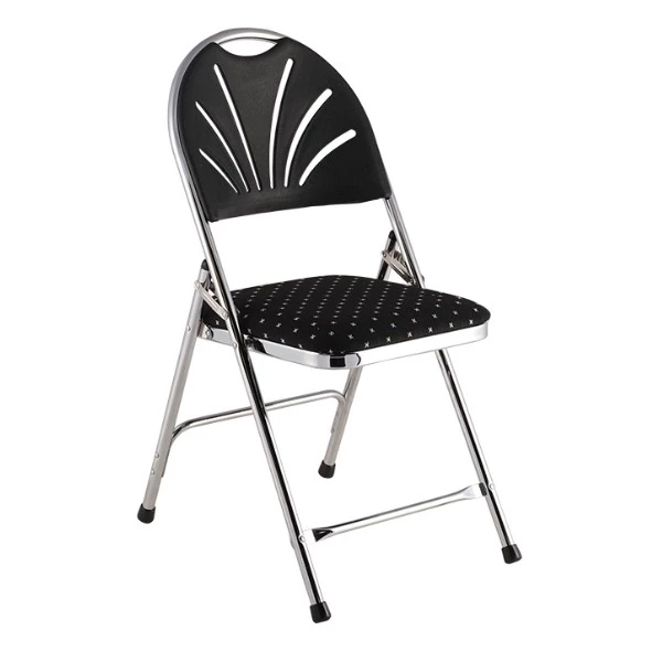 Deze klapstoel heeft een verchroomd frame en een gestoffeerde zitting. Deze stoel zit comfortabel en is toch gemakkelijk te vervoeren en op te bergen.