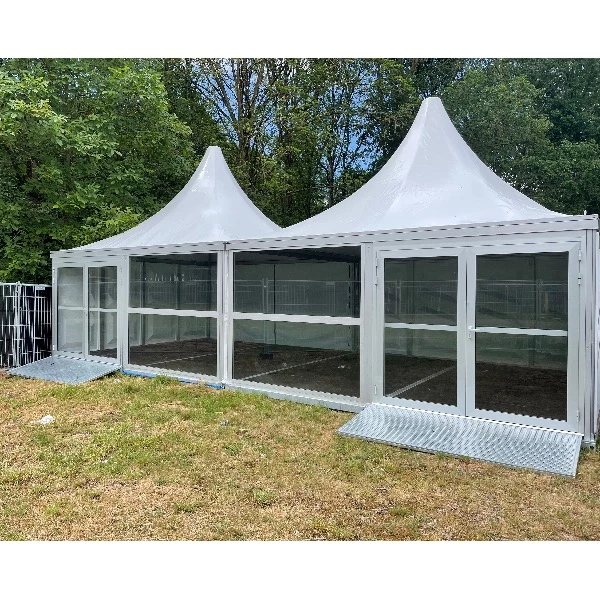De pagodetent met glazen wanden geeft een style volle uitstraling aan uw tent. Door de glazenwandpanelen krijgt u een stevige vaste wand waarin u mooi naar buiten kunt kijken. Het is mogelijk om in deze tent een enkele op dubbele loopdeur te laten plaatsen. De tenten zijn ideaal als entree tent of presentatie tent uw evenement.