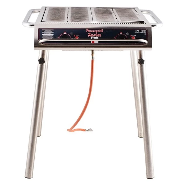 De powergrill heeft twee regelbare branders op propaan- en betaangas. Het geheel is vervaardigd in RVS. De vier poten zijn via een vleugelmoer afneembaar zodat de grill op een plateau geplaatst kan worden.