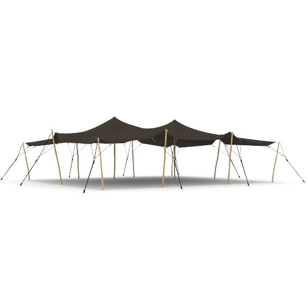 De stretchtent word gebouwd met kastanje houten palen en heeft een middenpaal. Er zijn geen zijzeilen beschibaar voor deze tent.